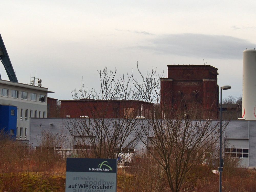 Signe d'adieu au crassier Hoheward à Herten avec les deux tours de la mine Ewald à Herten