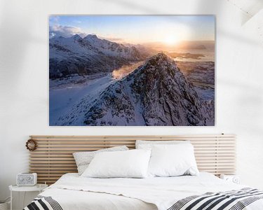 Profitez du lever du soleil à 6 heures du matin au sommet d'une montagne sur les Lofoten, dans le nord de la Norvège.