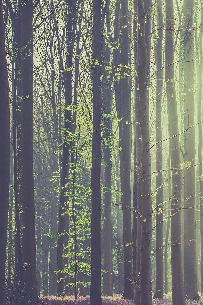 À l'aube, la lumière du soleil filtre à travers la forêt, jetant une lueur mystique sur un tapis de jacinthes des bois. Cette image capture la qualité éthérée de la lumière matinale qui illumine la verdure fraîche et les fleurs violettes vibrantes, créant un havre de paix dans la forêt.