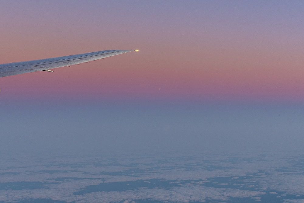 Se réveiller aux premières heures d'un long vol entre San Francisco et Auckland, et avoir cette vue. C'est un cadeau, n'est-ce pas ? Un magnifique ciel matinal aux teintes fantastiques, juste sur la ligne internationale de changement de date.