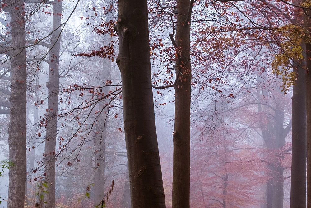 Matin de novembre brumeux avec des couleurs d'automne profondes.