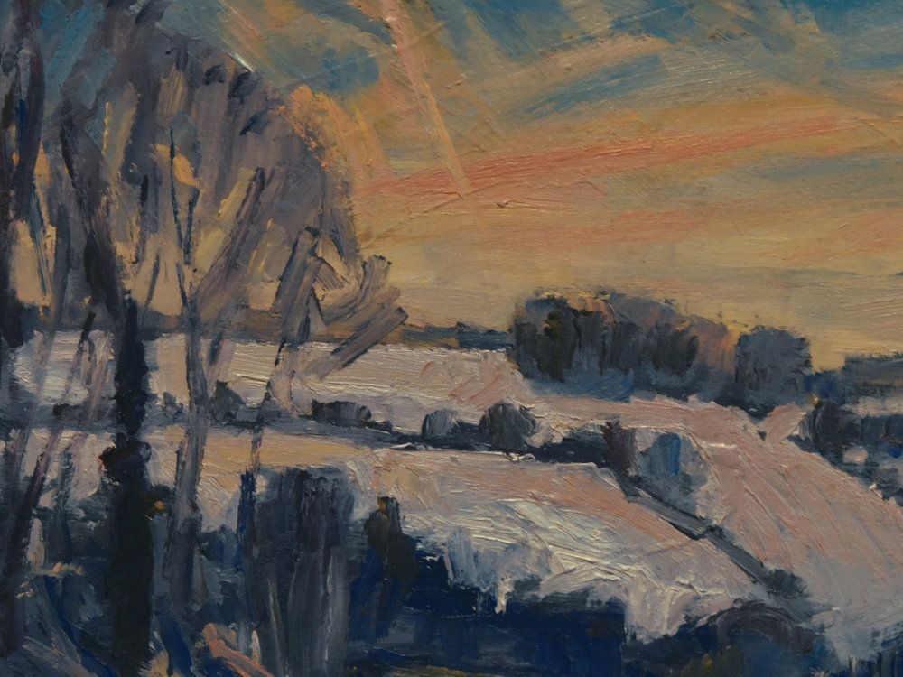 Les avions dessinent des traînées de condensation en orange. Des arbres, des bosquets et des tombes découpent les plaines enneigées et glaciales. Des taches nuageuses rouge saumon éclairent le paysage froid de l'hiver dans une palette de couleurs chaudes apocalyptiques. Le Limbourg méridional avec ses vallées fluviales est calme et enchanteur ce matin. Au loin, j'entends un corbeau, rien d'autre. Rien d'autre. Le roi Hiver est arrivé.