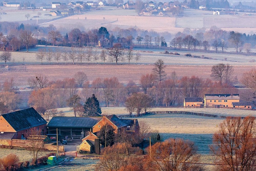 Brume matinale après une nuit froide dans la vallée avec des fermes entre Henri Chapelle et Aubel avec la crête de Battice au loin.