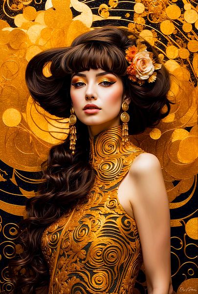 L'œuvre d'art : une mode intemporelle. Ce portrait dégage le charme de la bohème viennoise des années 1900, interprété pour le 21e siècle. L'élégante coiffure relevée, les boucles d'oreilles dorées marquantes et le col haut semblent tout droit sortis d'un magazine de mode historique de la Sécession.