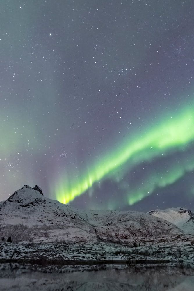 Aurore boréale ou lumière polaire dans le ciel nocturne des îles Lofoten, dans le nord de la Norvège. Image verticale avec des montagnes couvertes de neige et le lac Husvagn près de Svolaer avec des reflets des lumières au premier plan.