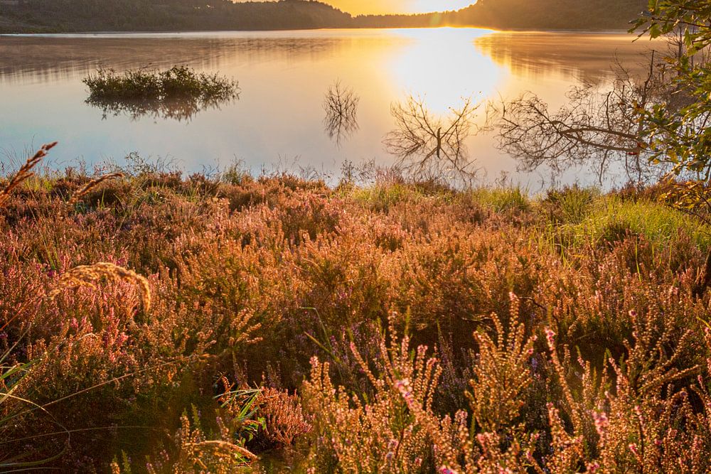 Cette photo a été prise sur la Heide de Malines dans le Limbourg, en Belgique. A 05h00 du matin, je me suis levé pour rencontrer 2 photographes amis pour prendre des photos. Au cours de notre randonnée, nous avons vu deux autres courses de cerfs et un renard ramper dans les buissons. Cette photo a été prise juste après 7h00 du matin au lever du soleil. La bruyère brille magnifiquement jaune / orange en raison du soleil levant. En raison de ces couleurs, cela s'appelle également l'heure d'or.