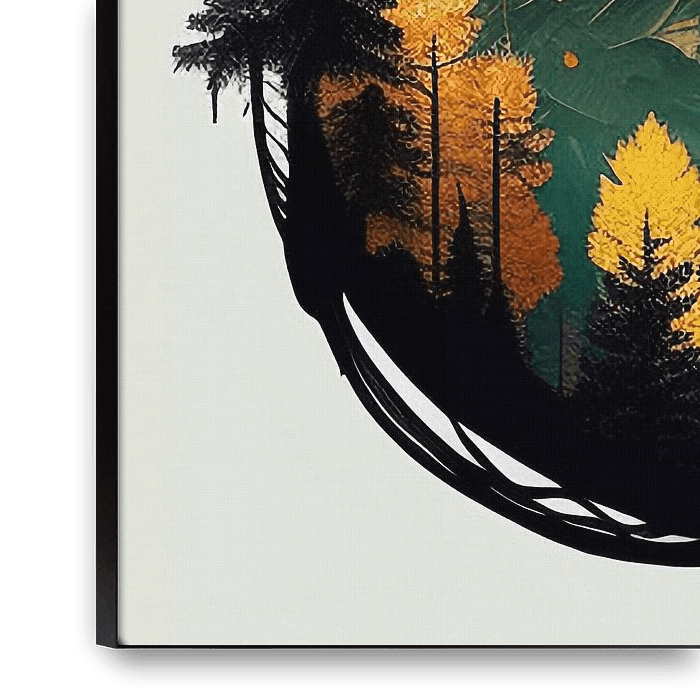 Cette peinture numérique captivante montre un paysage de montagne à couper le souffle dans un cadre circulaire d'arbres hauts et toujours verts. Les sommets des montagnes s'élèvent de manière dramatique, leurs pentes déchiquetées sont baignées d'une douce lumière dorée qui rappelle la chaleur d'un coucher de soleil automnal. Le…
