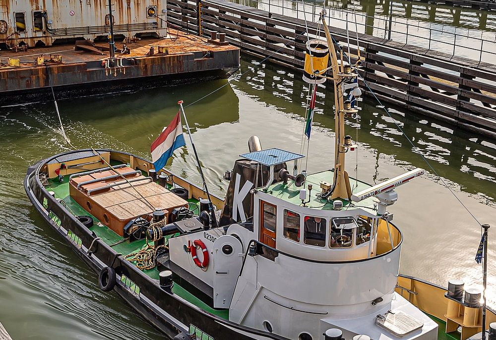 Le remorqueur Adriaan, qui date de 1957, entre dans l'écluse de Hansweert avec une détermination tranquille. Vu d'en haut, les lignes élégantes et arrondies de ce fier petit remorqueur se dévoilent ; compact, puissant et doté d'un caractère propre. Derrière lui, l'Adriaan tire un ponton avec de lourds éléments en acier, un joli contraste entre la puissance industrielle et le charme artisanal.