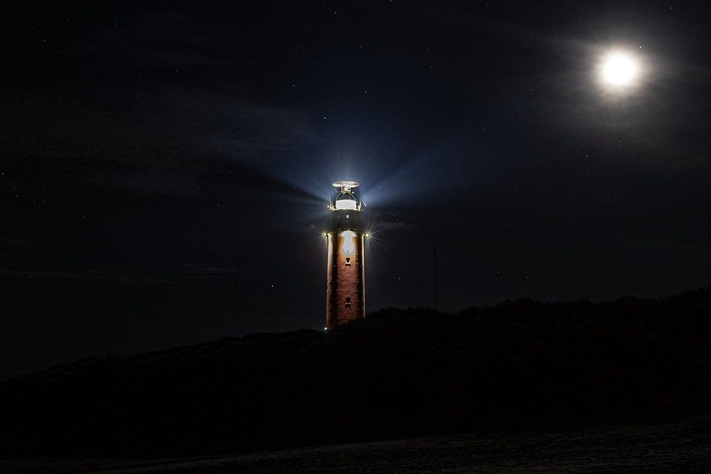 Au milieu de la nuit sur la plage de Texel avec la lune à côté du phare. Au premier plan, la dune sur laquelle se trouve le phare.