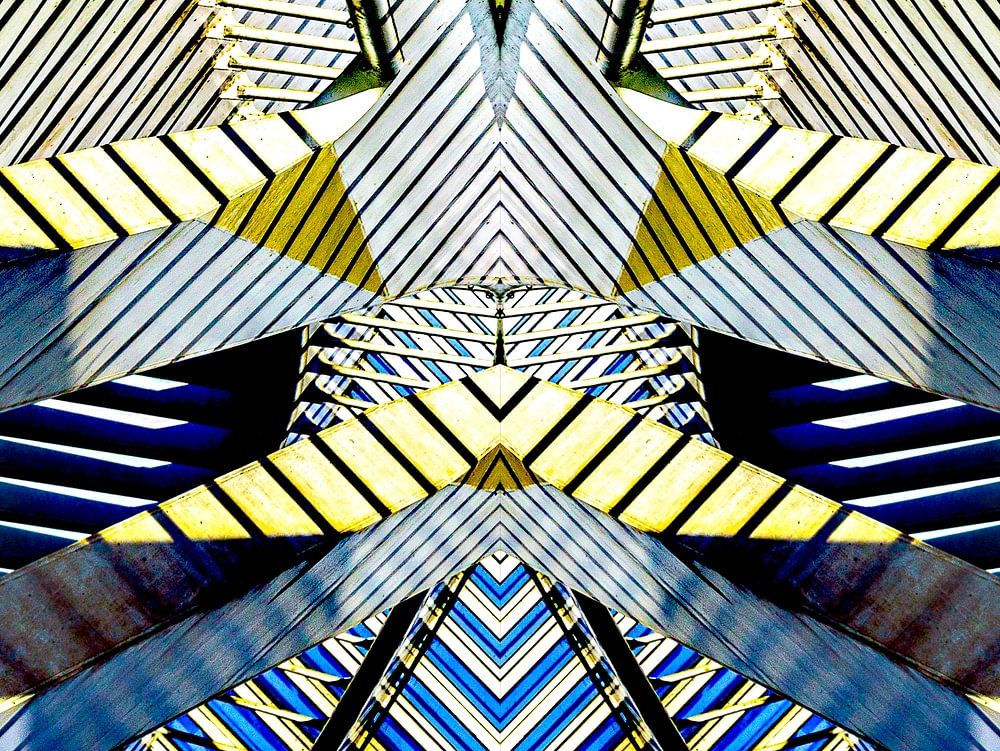 Jeu créatif à partir d'une photographie prise à la gare de Liège. L'œuvre est complètement symétrique. Vous obtiendrez le meilleur effet en plaçant la photo derrière un plexiglas. Un véritable accroche-regard.