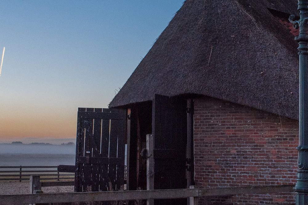 Avondrood bij zonsondergang op de Edese hei. De schaapskooi ligt er fraai bij op de koude avond in december.