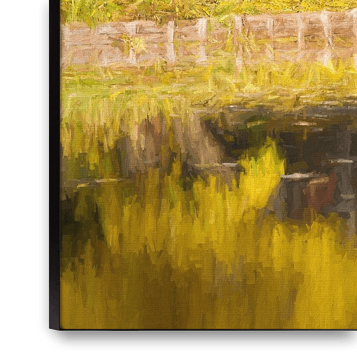Photographie prise au bord du lac Lietzensee à Berlin, Allemagne. Le pont avec son reflet dans l'eau et les arbres colorés confèrent à la photo une belle ambiance automnale. Le traitement de l'image, qui s'inspire de la peinture à l'huile, a permis d'obtenir un effet pictural.