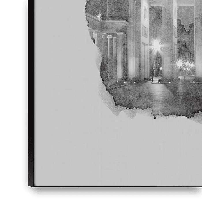 La porte de Brandebourg à Berlin est située sur la Pariser Platz dans le quartier de Mitte et est un emblème de la capitale allemande. Photographie urbaine de nuit. Design décoratif à l'aquarelle.