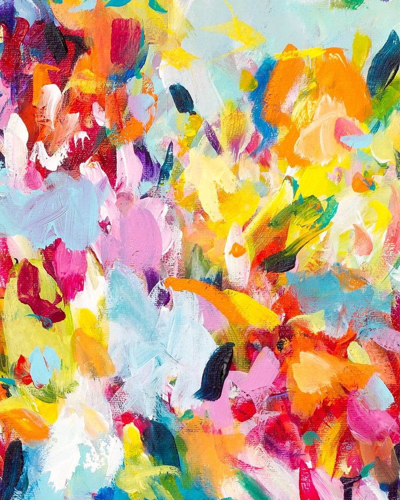 Une image puissante et colorée qui rappelle les fleurs. Abstrait et ludique, pour un sentiment de liberté et de spontanéité dans votre espace. Les couleurs chaudes sur un fond froid donnent une impression de gaieté.