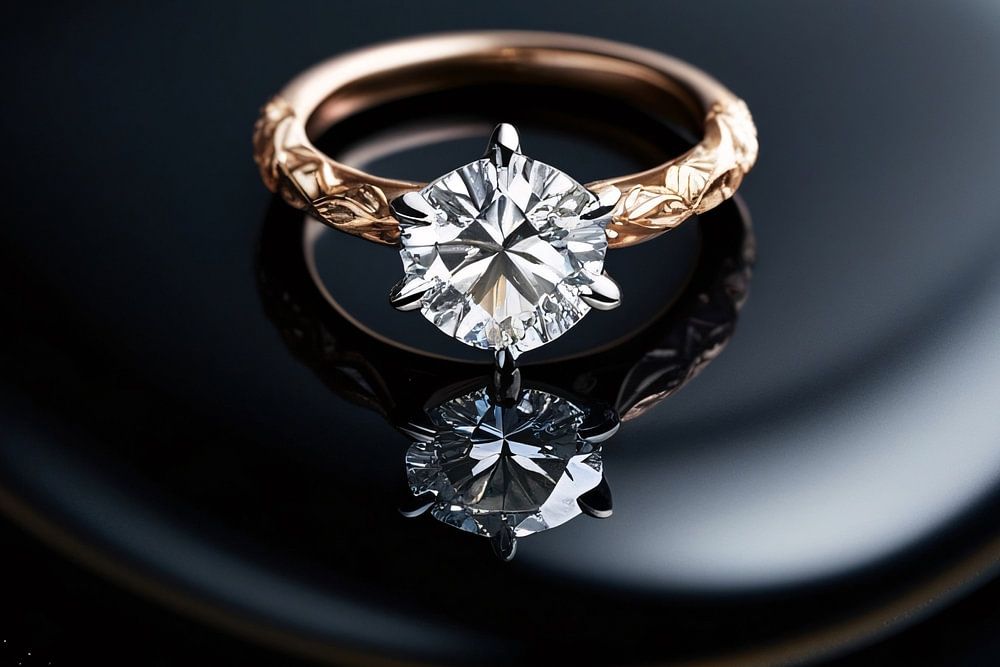 Ce modèle sophistiqué présente une bague à diamant solitaire avec un anneau aux détails complexes reposant sur un fond noir brillant. La bague respire l'élégance et le luxe, avec un diamant soigneusement taillé en son centre. La bande d'or ajoute chaleur et sophistication, tandis que le reflet de la bague et la fine poudre d'or qui entoure la composition évoquent un sentiment d'exclusivité et de beauté intemporelle. Cette bague est parfaite pour ceux qui recherchent un objet à la fois subtil et frappant, par exemple comme bague de fiançailles ou comme accessoire de luxe. La monture monochrome met l'accent sur la brillance et la qualité artisanale de la bague, ce qui en fait un choix idéal pour tous les amateurs de design minimaliste et de bijoux de haute qualité.