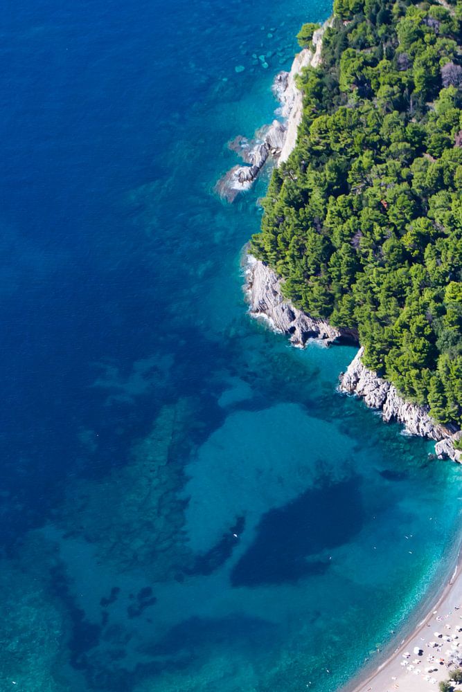 Baie verte paradisiaque (baie) entre les montagnes vertes et la mer azurée. Paysage ci-dessous (photo aérienne d'un parapente) avec la côte et la mer bleue, Monténégro, Budva.