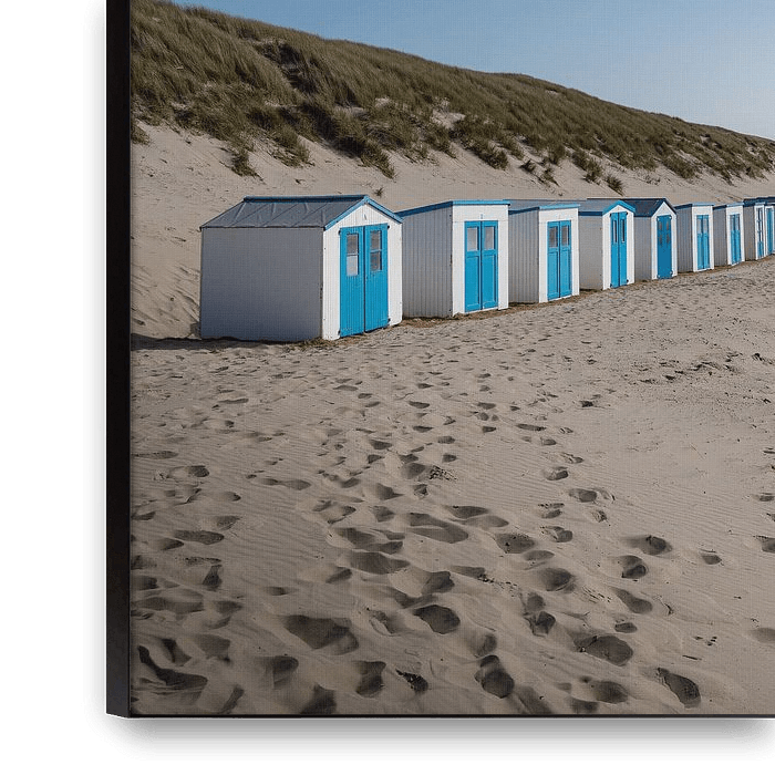 Une longue rangée de cabines de plage bleues et blanches par une belle journée d'été sur la plage de l'île néerlandaise de Texel. Les cottages se dressent le long des dunes. La mer est visible au loin, une mouette vole dans les airs et il y a de nombreux pas dans le sable. Accrocherez-vous ce magnifique tirage photo sur votre mur ?