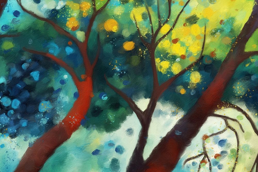 Des arbres vibrants aux branches fantaisistes se détachent sur un fond multicolore, créant une mosaïque de feuilles dans différentes nuances de bleu, de vert et de jaune. Le rendu stylisé évoque une qualité onirique qui suggère une fusion de la nature et de la fantaisie.