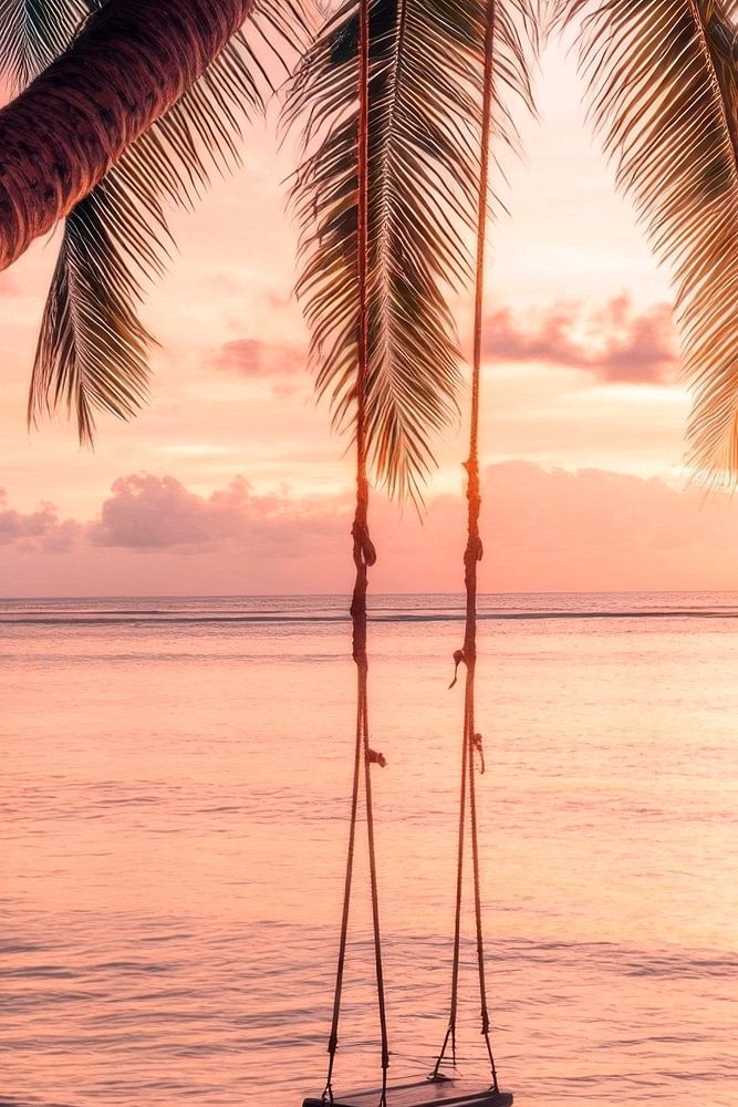 Dans de douces couleurs pastel, le coucher de soleil enveloppe l'horizon, tandis que les douces vagues de la mer dansent dans la lumière. Une balançoire solitaire, se balançant doucement à une branche de palmier, invite à la rêverie et à la détente. Ce moment de paix, capturé dans ce décor idyllique, fait s'éloigner l'agitation du quotidien.