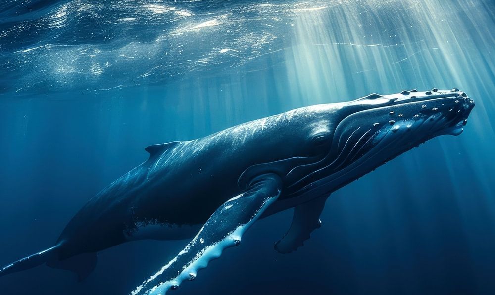 C'est une scène calme, presque méditative, dans laquelle les rayons du soleil brisent la surface de l'eau et créent un jeu de lumière qui accentue la grâce de la baleine. La majestueuse baleine, avec ses longues nageoires pectorales emblématiques et les nodules sur sa tête, se déplace comme si elle flottait, entourée d'un halo de lumière. Ces rayons de lumière créent un spectacle visuel qui accentue le sentiment de profondeur et de tranquillité incommensurable de l'océan.