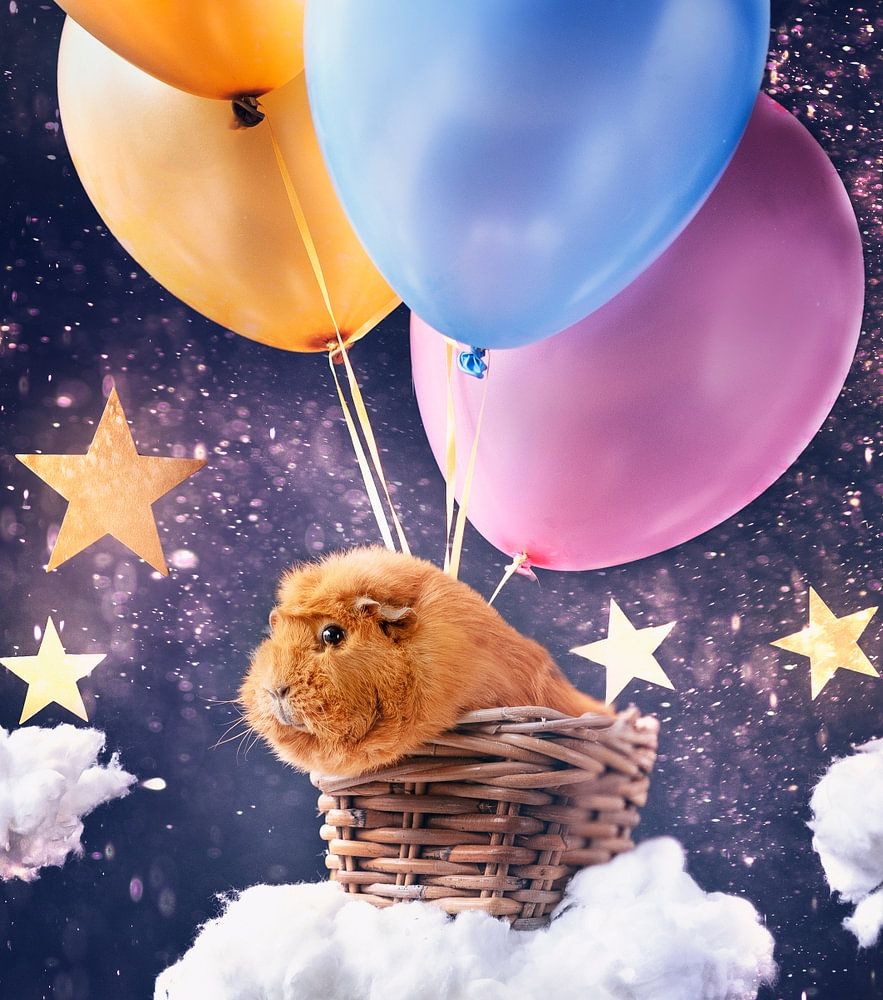Un cochon d'Inde orange dans un ballon, volant dans un paysage nocturne d'étoiles et de nuages.