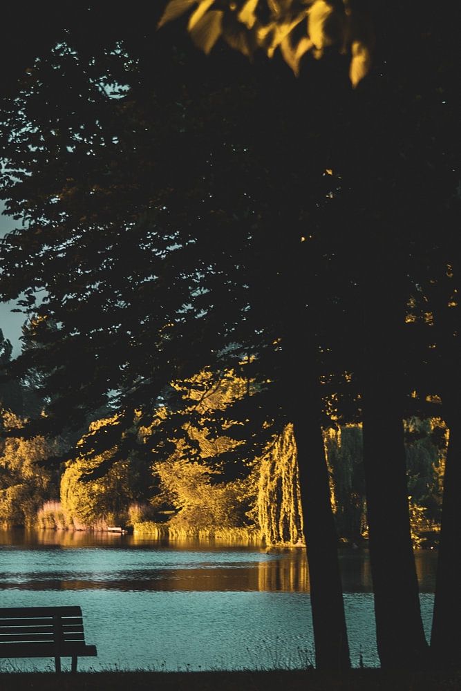Regarder le soleil du matin derrière un arbre. Un banc vide à l'ombre sur la dame de fer à Den Bosch, avec vue sur l'eau.