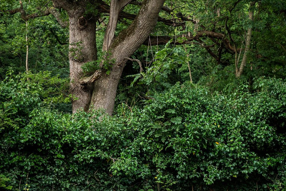Deux bancs de pierre entourés de verdure dans le parc romantique du château de Charleville, Tullamore, Irlande