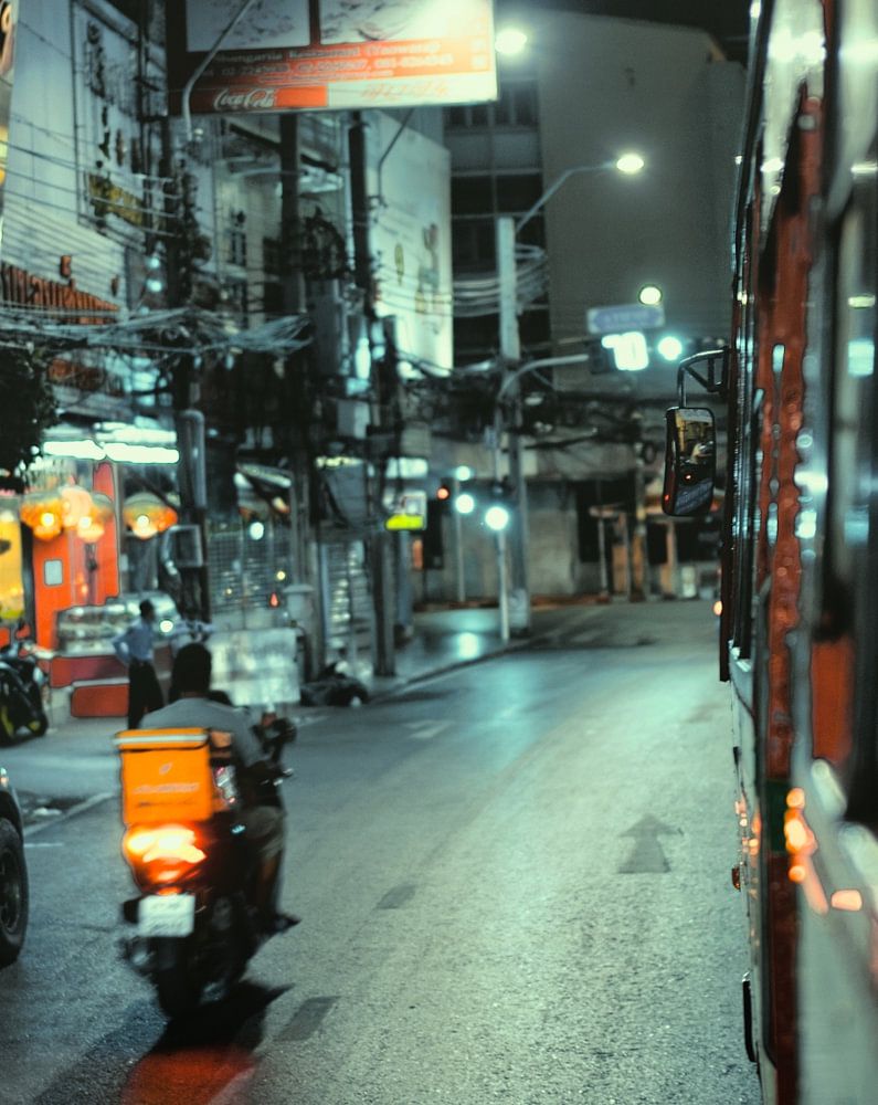 Il existe de nombreux moyens de se déplacer à Bangkok. Un moyen est le tuktuk, le taxi ou le scooter et un autre moyen est le métro ou comme moi le bus. L'avantage des bus en Thaïlande, c'est qu'ils n'ont pas de fenêtres et que j'ai pu m'y accrocher pour prendre des photos de la ville.