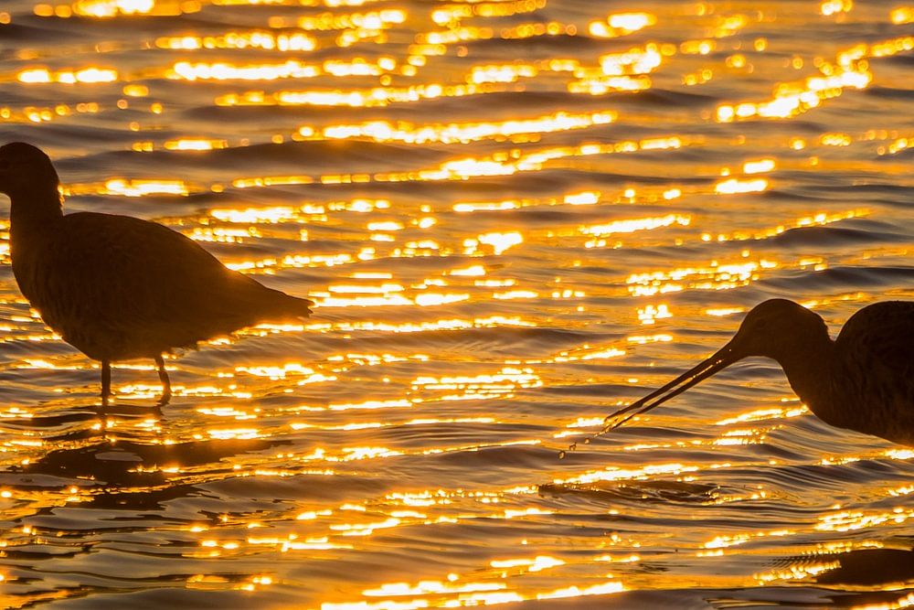 Deux bécasses à queue noire pendant un très beau coucher de soleil. L'eau devient toute dorée, orange et jaune. Ils se nourrissent dans l'eau dans le parc Lingezegen près d'Arnhem à Elst. Les godwits forment une belle silhouette en raison de la sous-exposition, ce qui donne à l'image une puissance supplémentaire.