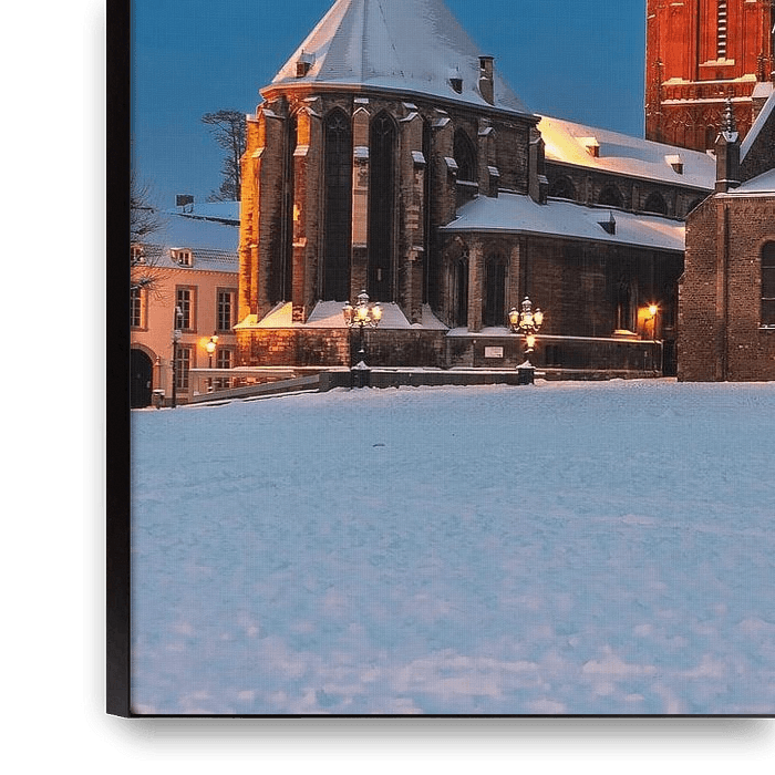 La basilique Saint-Servatius à l'heure bleue avec le vrijthof enneigé par une froide matinée de janvier.