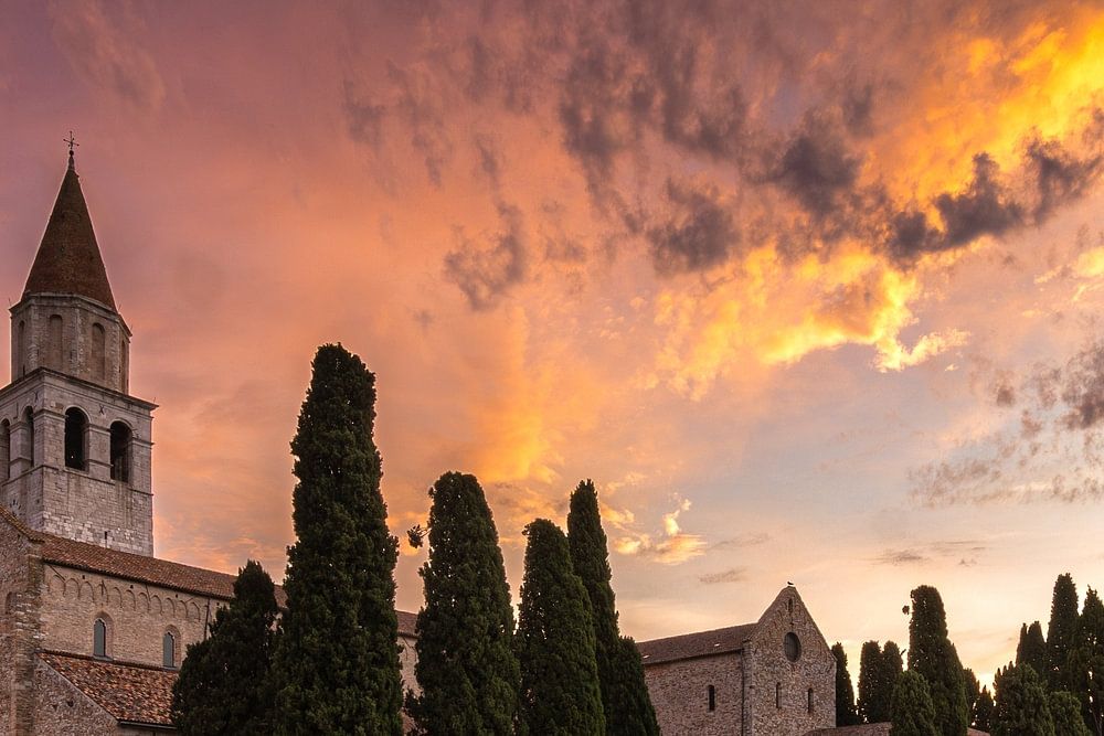 Entourée de cyprès majestueux, la basilique d'Aquilée, officiellement Basilica di Santa Maria Assunta, se dresse. L'église date du XIe siècle. La basilique a joué un rôle clé dans la fortune d'Aquilée, qui était autrefois l'une des plus grandes et des plus riches villes du premier empire romain, la basilique elle-même étant la plus grande et la plus importante du monde paléochrétien après celle de Rome.