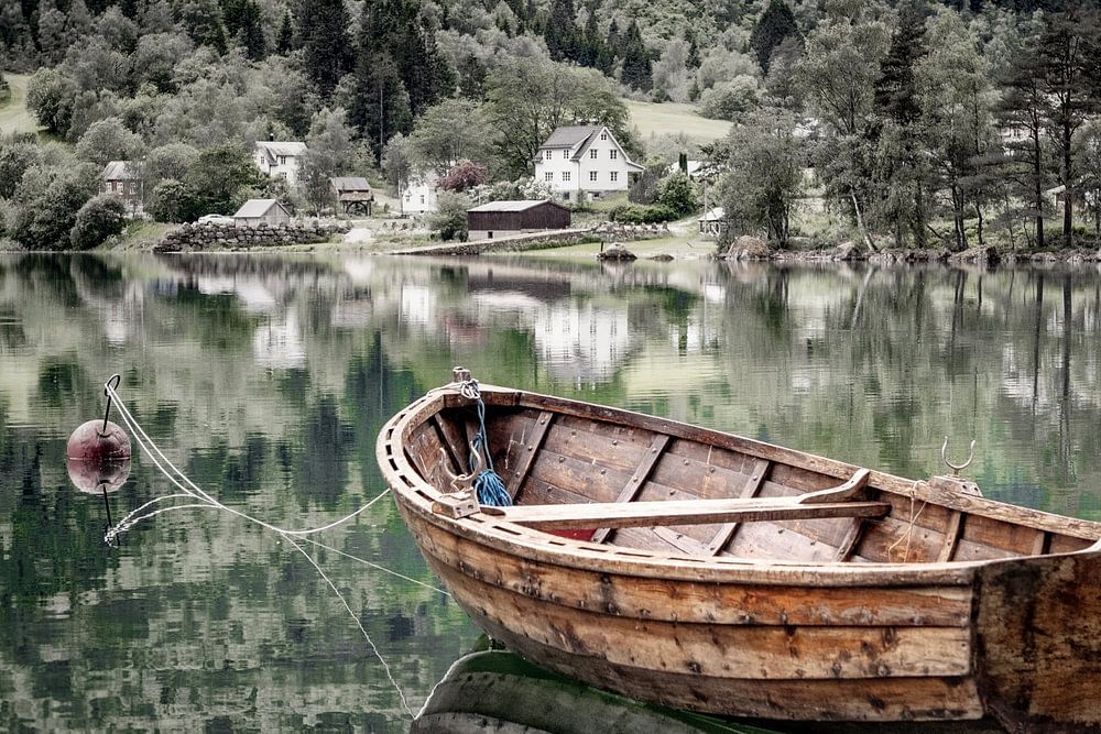 Un bateau à rames en bois sur un lac près du joli village de Helle, dans le sud-ouest de la Norvège.