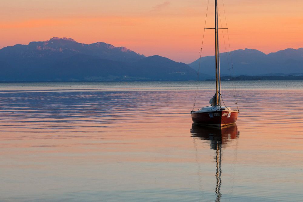 Bateau à voile au coucher du soleil sur le Chiemsee, Bavière, Allemagne