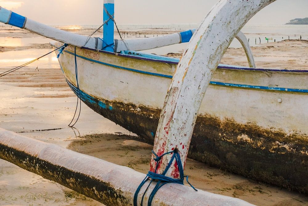 Un bateau balinais à balancier utilisé pour la pêche repose sur la terre ferme près de l'île balinaise de Nusa Lembongan. J'attends que la marée monte à nouveau. Le coucher du soleil donne une vue encore plus intense.