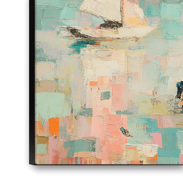 Cette peinture impressionniste montre un voilier blanc flottant tranquillement sur une eau turquoise. De doux reflets de lumière et des coups de pinceau souples confèrent à la scène profondeur et calme. À droite, deux personnages sont assis sur un ponton de bois sombre, tous deux tournés vers l'eau. Derrière eux se dressent des montagnes bleu-gris qui se fondent doucement dans un ciel pastel aux tons de pêche, de bleu et de blanc. Un arbre vert s'avance dans l'image depuis la droite et complète l'atmosphère naturelle. La composition équilibrée du bateau, du ponton et du paysage évoque l'harmonie, le calme et un moment paisible au bord de l'eau.