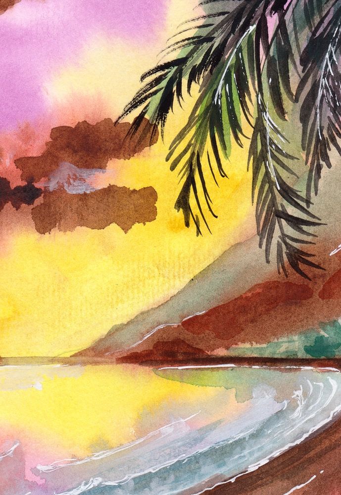 Aquarelle représentant un petit bateau stationné sur la plage sous des palmiers, devant un coucher de soleil coloré derrière des montagnes lointaines.