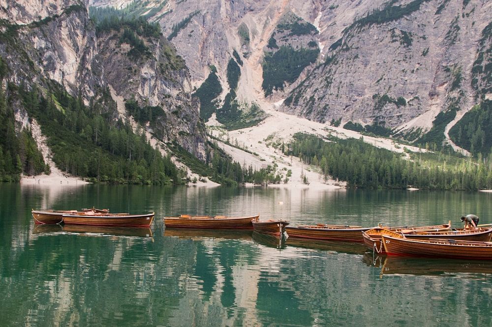 Ce magnifique lac bleu/vert appelé Lago di Braies ou Pragser Wildsee est l'un des plus beaux lacs des Dolomites italiennes. Le lac est très accessible et donc très populaire auprès des touristes. Un hangar à bateaux en bois se trouve au bord du lac et des bateaux à rames en bois peuvent être loués pour une excursion sur les eaux bleues.