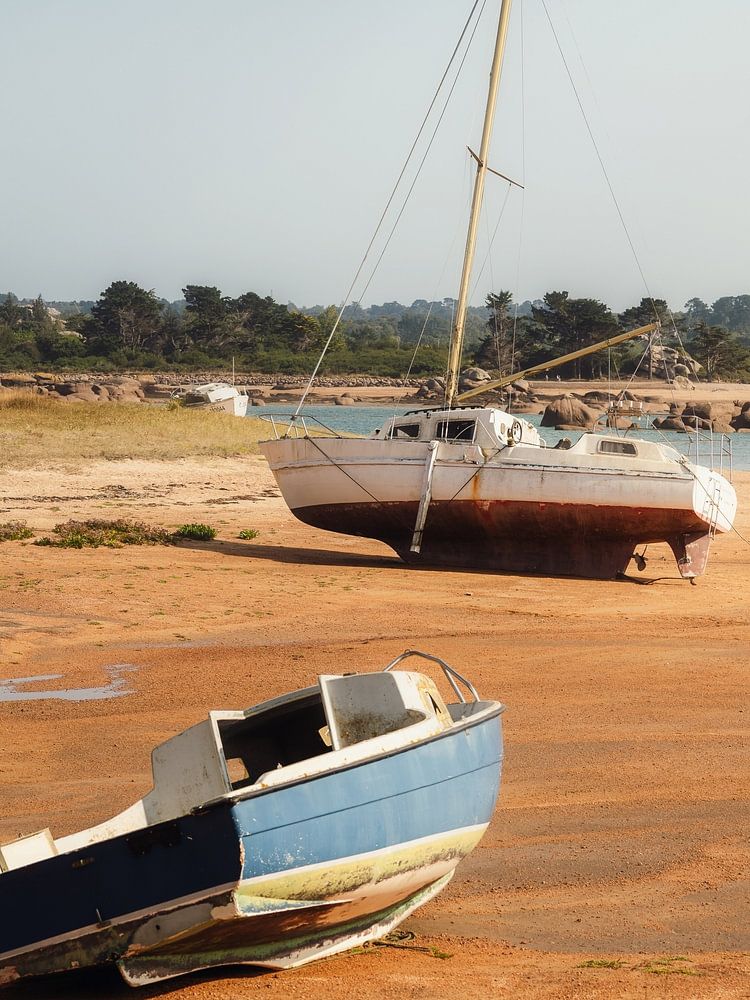 Bateaux attendant la marée. La mer autour de la Bretagne, en France, présente l'un des écarts de marée les plus extrêmes au monde. Elle peut parfois varier de 15 mètres ! L'avantage, c'est que l'on peut souvent apercevoir des bateaux à sec à marée basse. Un sujet fantastique pour la photographie !
