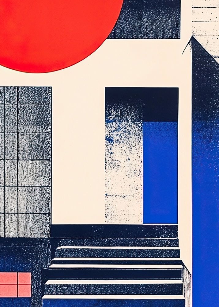 Une affiche pour l'exposition dans le style Bauhaus, avec des formes géométriques simples et une coloration bleue, rouge et blanche, imprimée sur papier. Le titre "Bauhaus" est inscrit en grandes lettres en haut au centre, entouré d'illustrations architecturales. Un escalier menant à une porte ouverte apparaît dans le coin inférieur droit, ajoutant de la profondeur à la composition. Le design typographique sobre ajoute un contraste à l'esthétique générale.