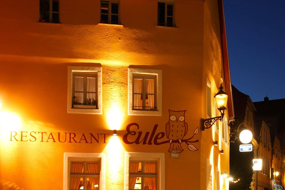 Altstadtgasse avec Gasthaus Eule au crépuscule, Haute-Franconie, Franconie, Bavière, Allemagne, Europe