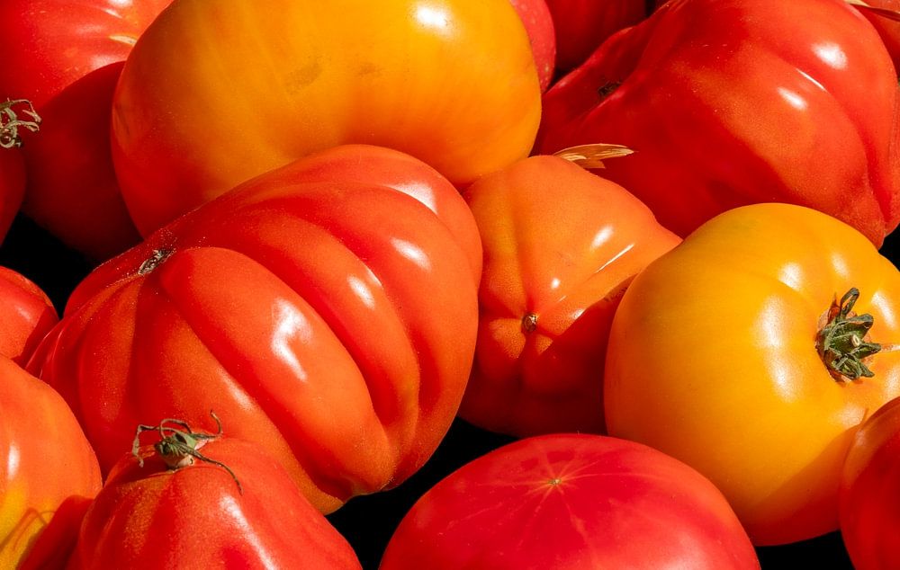 Photo de détail en plein format avec de nombreuses tomates fraîches éclairées par le soleil