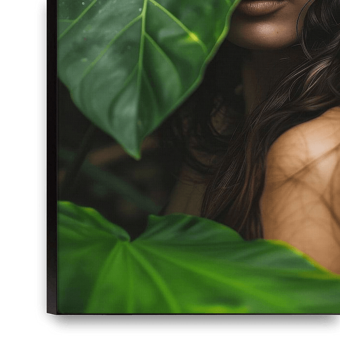 Au milieu de feuilles vertes luxuriantes qui ressemblent à des rideaux naturels, un regard mystérieux brille. Les yeux brillants en forme d'amande et la peau douce et bronzée du personnage créent un contraste fascinant avec l'environnement animé. Cette composition transmet un lien avec la nature qui est à la fois intime et apaisant.