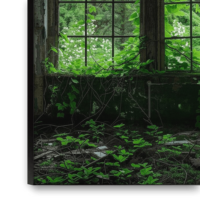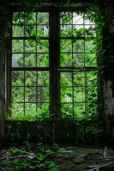L'image montre une fenêtre envahie par la végétation qui donne sur un paysage vert luxuriant. Des plantes grimpantes et des feuilles encadrent les vitres brisées et créent un sentiment d'éphémère. Le contraste entre la nature vivante et l'espace délaissé raconte une histoire de renaissance et de force inexorable de la nature.