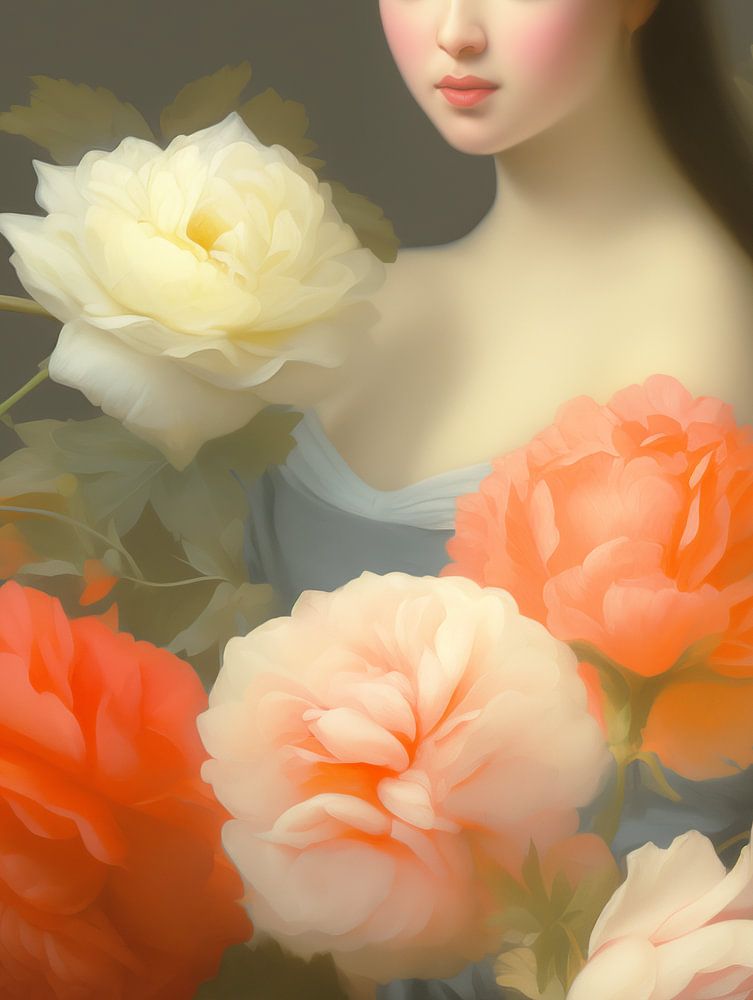 Portrait classique d'une femme de la Renaissance avec des roses, un petit oiseau vole dans le ciel.