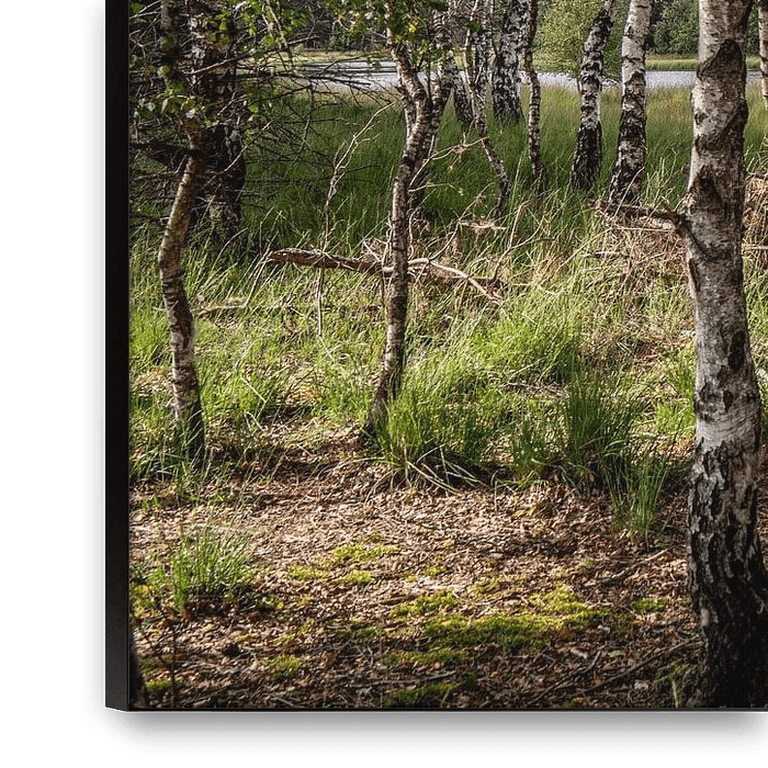 Sur cette photo, vous regardez au-delà de quelques bouleaux en direction d'une tourbière. Cette œuvre fait partie d'une série de photographies que j'ai prises dans cette tourbière. La tourbière est belle à tout moment et si vous restez immobile plus longtemps, vous pouvez apprécier toutes sortes de détails.