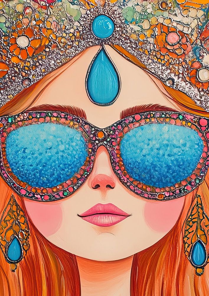Beauté féminine - Ce portrait féminin coloré montre une jeune femme joyeuse portant de grandes lunettes de soleil détaillées et une couronne richement décorée, sur un fond turquoise éclatant.