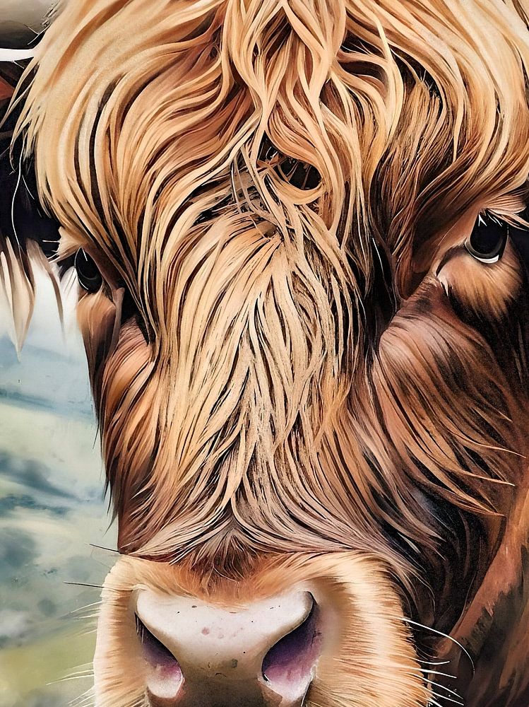 Le Highlander écossais, avec sa stature imposante et ses cornes majestueuses, est au centre du tableau. Son pelage épais et son museau duveteux sont amoureusement rendus par de doux coups de pinceau, donnant vie à son apparence calme et réfléchie. La présence puissante de l'animal contraste magnifiquement avec la douceur des couleurs pastel qui l'entourent.