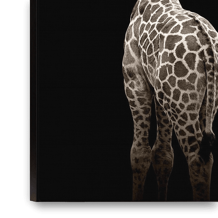 Le fond noir contrasté met en évidence la forme élégante et les motifs naturels de la girafe, lui donnant un aspect propre et minimaliste.