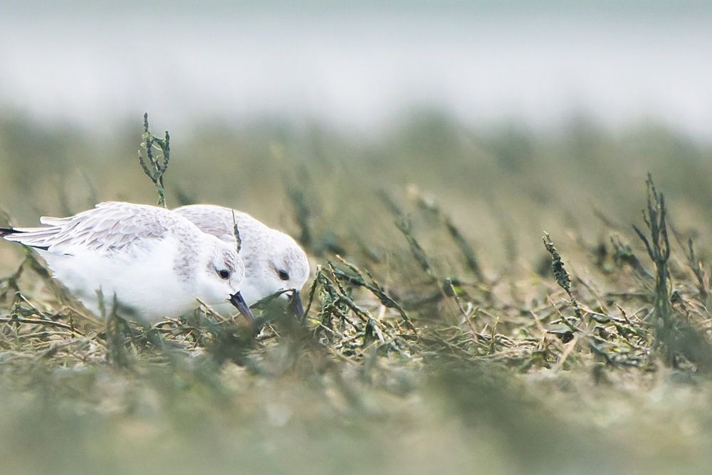Deux bécasseaux sanderling en quête de nourriture. Cette photo a été prise lors d'une froide journée d'hiver à Texel.