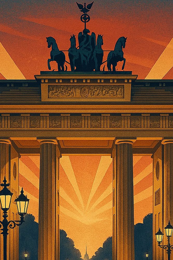Cette affiche de voyage vintage de Berlin capture l'élégance intemporelle de la Porte de Brandebourg dans un style Art déco audacieux. Conçue avec des lignes épurées, des poutres rayonnantes et des tons chauds de coucher de soleil, l'œuvre d'art transforme l'un des sites les plus emblématiques d'Allemagne en une œuvre d'art murale saisissante. Parfait pour les amoureux de l'architecture et de l'histoire européennes, ce poster Art déco Berlin apporte une esthétique rétro à tout espace intérieur. Qu'il s'agisse de décorer votre salon, votre bureau ou un mur d'exposition, ce poster de l'Allemagne ajoute un sentiment de sophistication et d'envie de voyager. La combinaison de bleus profonds, d'oranges éclatants et de reflets dorés crée une atmosphère majestueuse et cinématographique, idéale pour les passionnés de voyage et les collectionneurs d'illustrations vintage. Un cadeau parfait pour les admirateurs de Berlin, les voyageurs du monde entier ou ceux qui apprécient le design inspiré de l'âge d'or des affiches de voyage. Imprimée en haute résolution, cette œuvre d'art allie nostalgie et décor moderne, célébrant l'héritage culturel de Berlin à travers un art rétro intemporel.